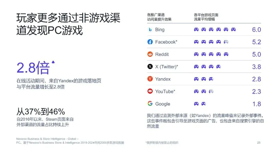 此外,来自 Bing、Facebook、Reddit 等平台导向游戏页面的 PC 流量增长速度远超 Google,这说明游戏曝光正在从“游戏生态内竞争”转向“泛互联网注意力竞争”。与此同时,PC 游戏页面的外部来源流量占比已从 37% 提升至 46%,进一步验证了非游戏平台正在成为关键的用户发现入口,因此品牌必须更积极布局跨媒体触点。