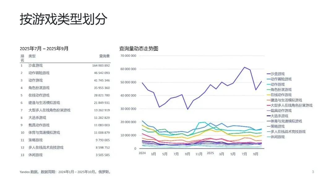 在内容层面,俄罗斯市场呈现出“头部稳定、增量分散”的结构性特征。2025 年第三季度,沙盒类游戏以约 1.65 亿次搜索量位居其他类型之首,显著领先于动作冒险(约 4650 万)与动作类游戏(约 4170 万)。