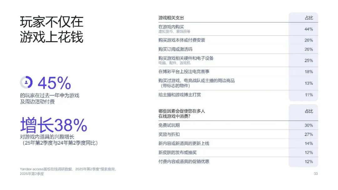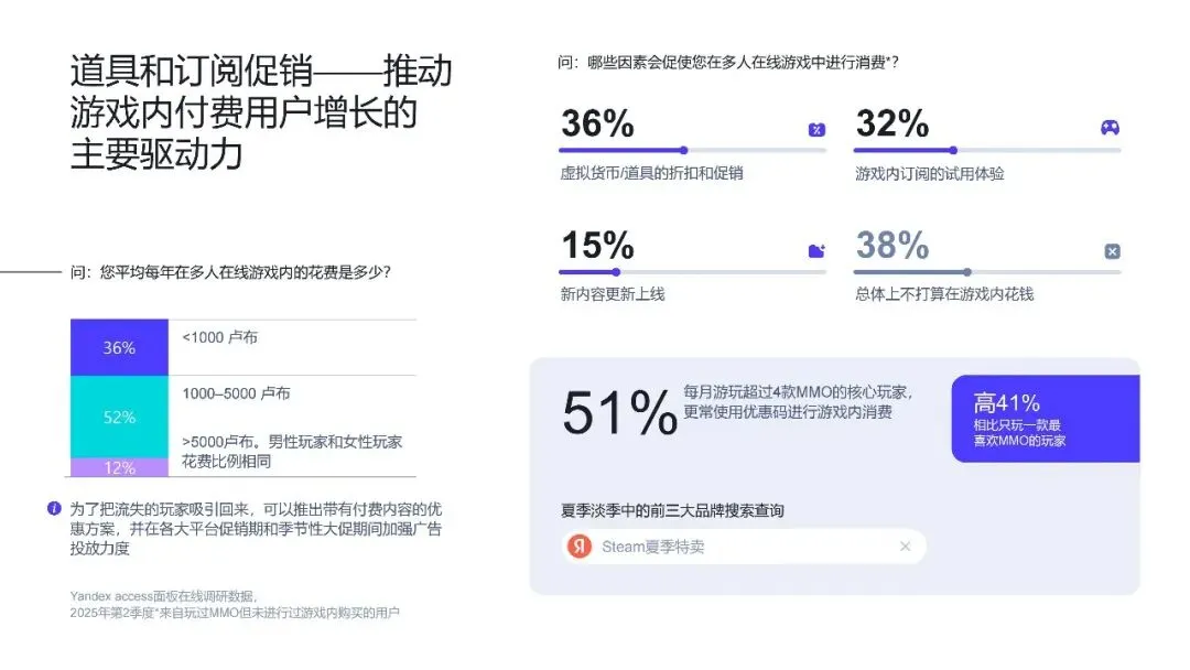 影响玩家付费的核心因素仍然围绕折扣、促销、免费试用与重大更新。尤其值得关注的是“皮肤经济”,Yandex 于 2025 年第二季度针对 MMO 玩家开展的在线调查显示,44% 尚未进行过游戏内购买的玩家对皮肤类内容表现出明确兴趣,其共同购买动机包括稀有性、社交认同与个性化表达。