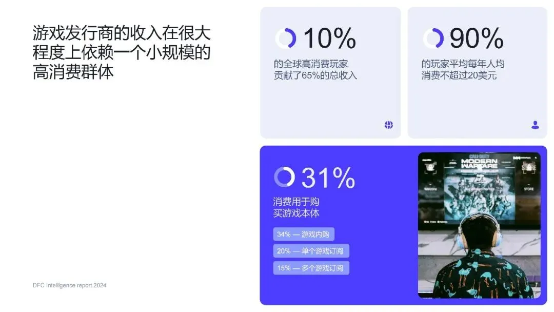 在付费结构中,高价值用户的贡献占据主导地位:仅约 10% 的“鲸鱼用户”贡献 65% 的收入,其中 25-34 岁男性 是最重要的商业人群。多游戏并行玩家的付费倾向也更高,例如玩四款以上 MMO 的用户,其付费概率比玩单一游戏的高 41%1。这意味着,留存、运营与召回策略决定了游戏的整体商业质量。