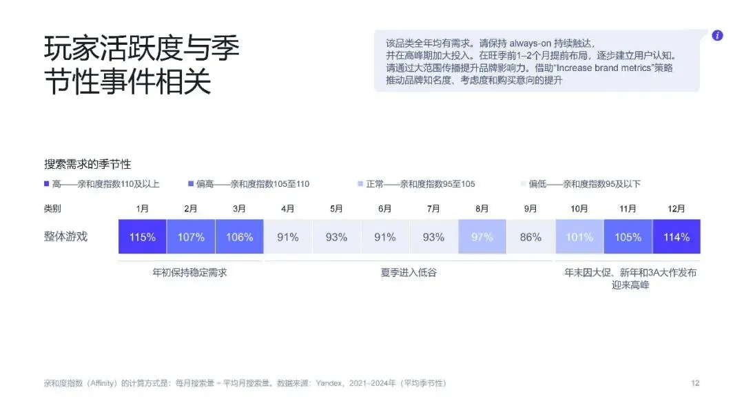 游戏搜索呈现明显的季节性波动,12 月与 1 月达到全年高峰,而 4-8 月则相对平稳。品牌需要全年保持基础曝光,并提前 1-2 个月建立认知,以便在旺季承接流量增长。同时,新年假期也是开发者集中评估合作机会与产品布局的重要窗口期,适合进一步触达并传递面向开发者的解决方案与支持。
