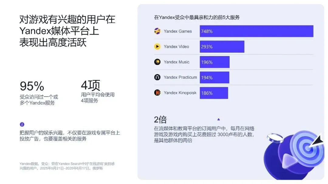 当前,95% 的游戏受众使用至少一项 Yandex 服务,人均使用 4 项。这些服务——包括视频、音乐、电影搜索、学习平台等——本身就与游戏兴趣高度相关,为广告提供了天然的内容环境。