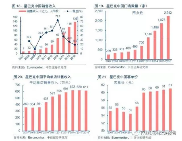 根据Euromonitor数据,星巴克中国2016年网点数2242家,销售收入138亿元人民币,平均单店收入617万元,客单价61元。根据目前喜茶、奈雪の茶等品牌的运营情况,我们判断未来行业龙头门店总量可达1000家左右(约为星巴克的1/2),而平均单店年销售额有望达到1200万元(约为星巴克的2倍),年销售收入有望达到120亿元以上,与星巴克销售体量相当。