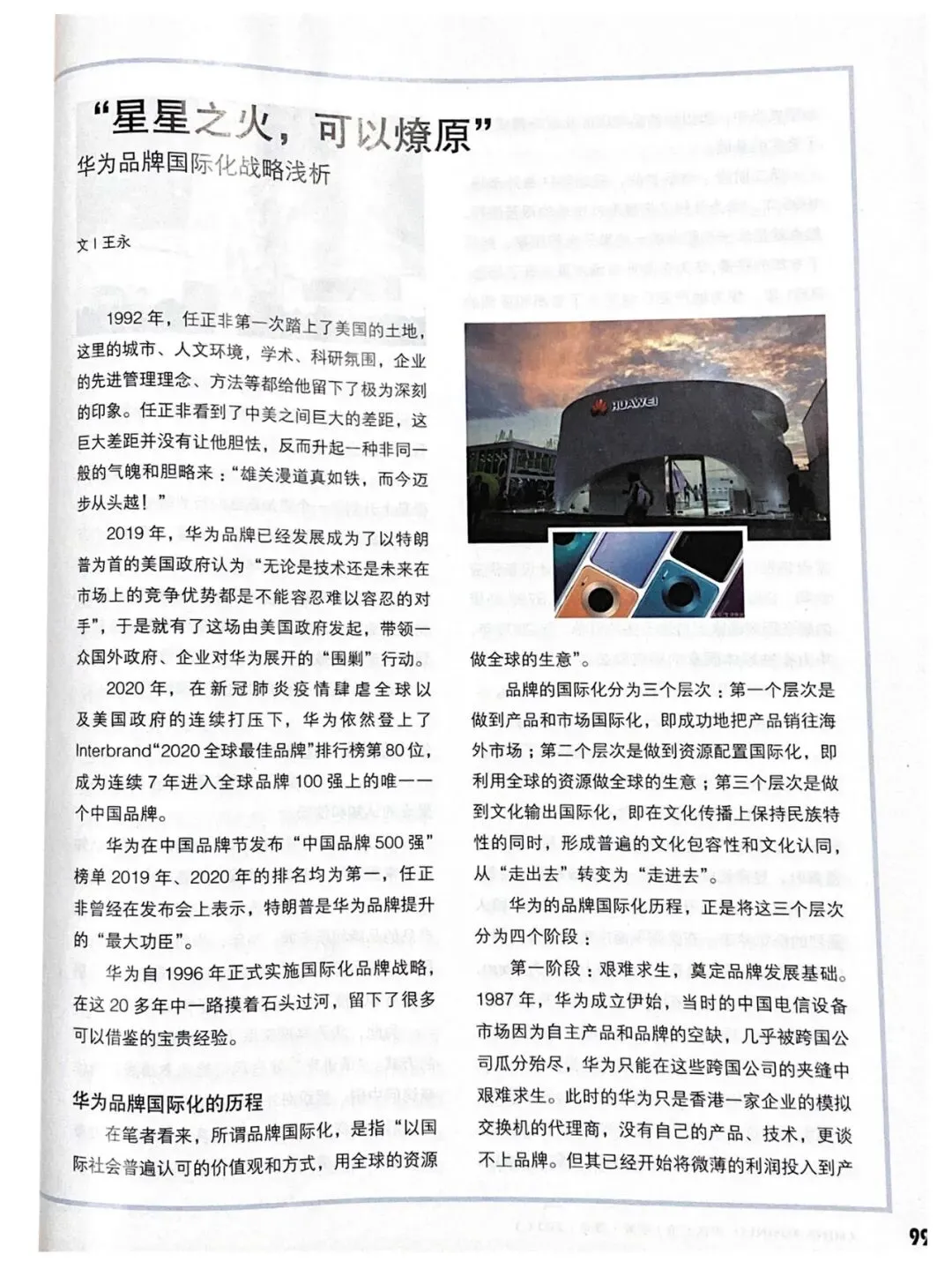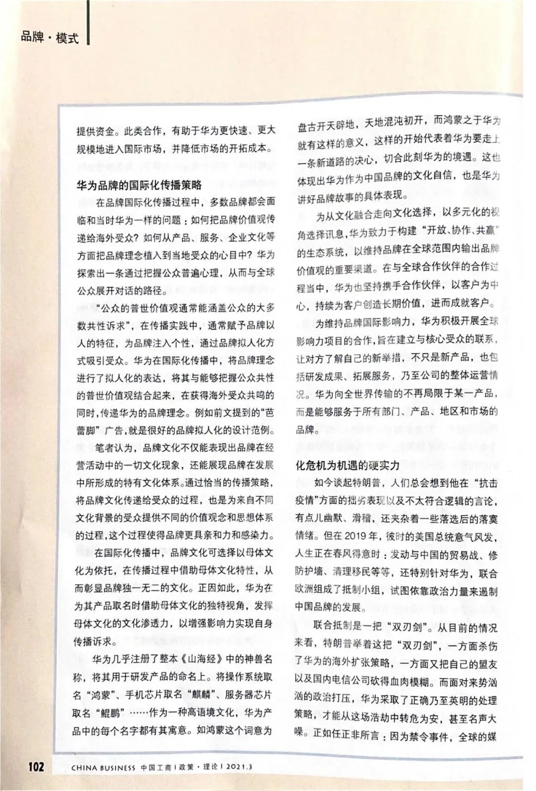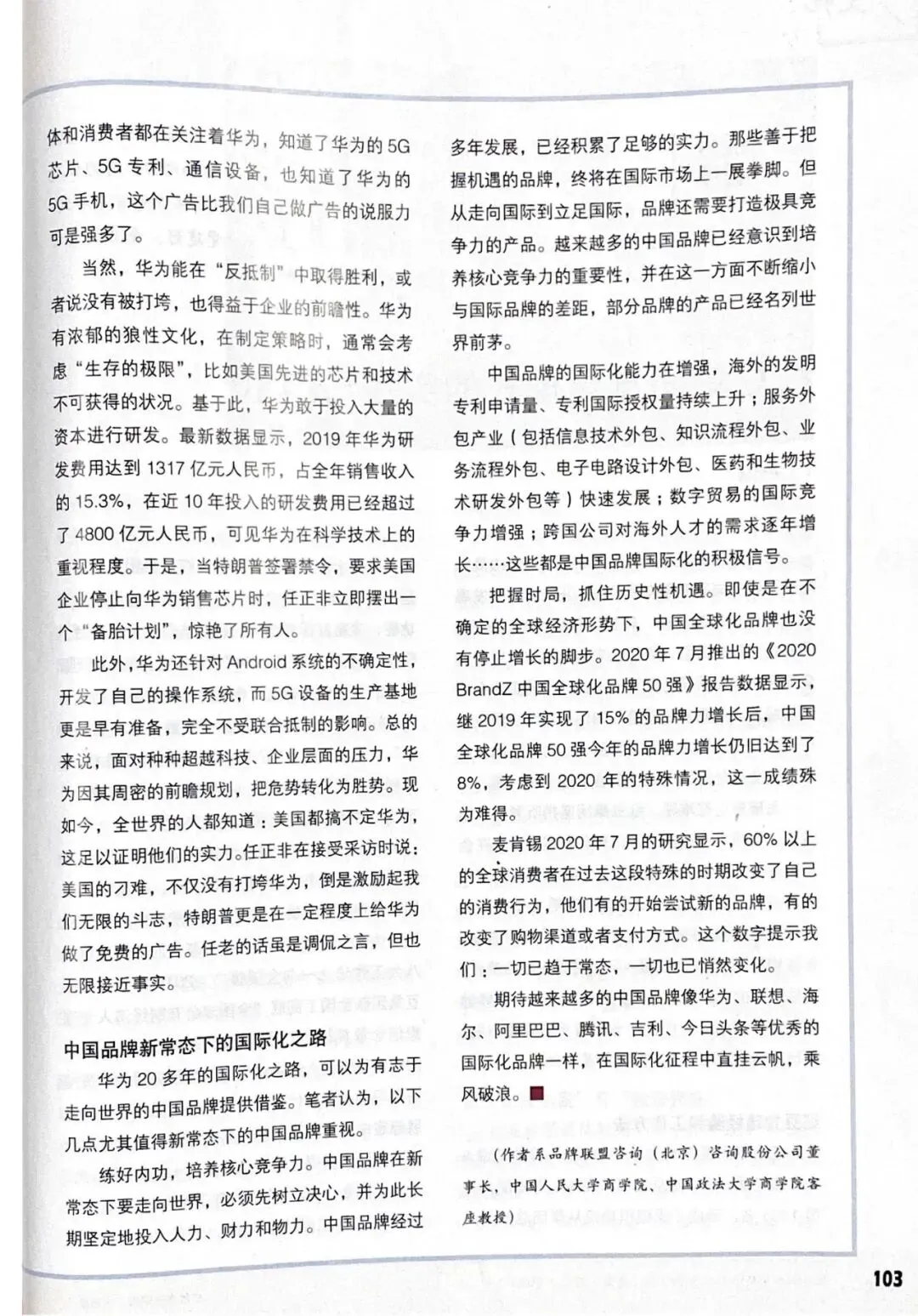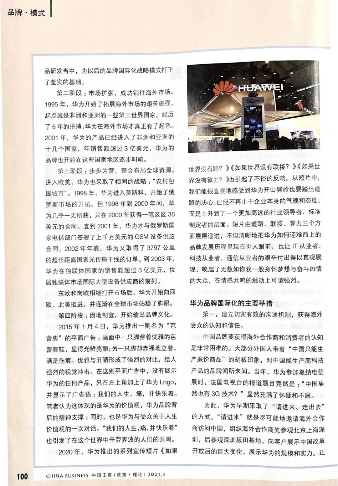 6月2日晚,华为“鸿蒙操作系统”正式发布,意味着源于美国的苹果系统、安卓系统之外,中国自主研发的手机操作系统成功突围。华为致胜的秘诀是什么?“以国际社会普遍认可的价值观和方式,用全球的资源做全球的生意”——20多年的持续化国际化品牌战略。2020年,华为入选Interbrand“2020全球最佳品牌”排行榜第80位,成为连续7年进入全球品牌100强上的唯一一个中国品牌;2019年、2020年,华为在中国品牌节“中国品牌500强”连续两年位列第1。