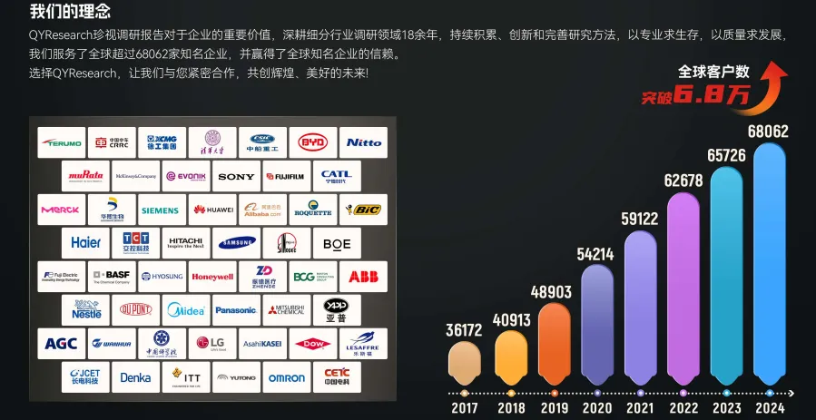 QYResearch成立于2007年,总部位于美国洛杉矶和中国北京。经过连续19年多的沉淀,QYResearch已成长为全球知名的、面向全球客户提供细分行业调研服务的领先咨询机构,专注为企业提供专业的市场调查报告、行业研究报告、可行性研究、IPO咨询、商业计划书、制造业单项冠军申请和专精特新“小巨人”申请、市占率证明等服务。业务遍及世界160多个国家,在全球30多个国家有固定营销合作伙伴,在美国、日本、韩国、印度等有分支机构,在国内主要城市北京、广州、长沙、石家庄、重庆、武汉、成都、、太原、昆明、日照等地设有办公室和专业研究团队。