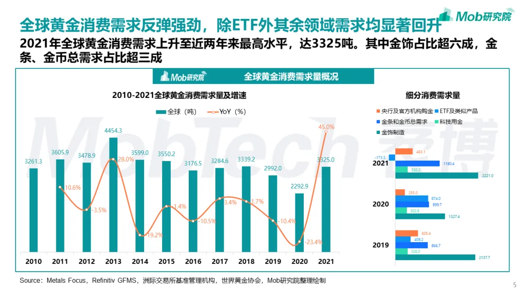 全球黄金消费需求反弹强劲,中国黄金消费也顺势上扬