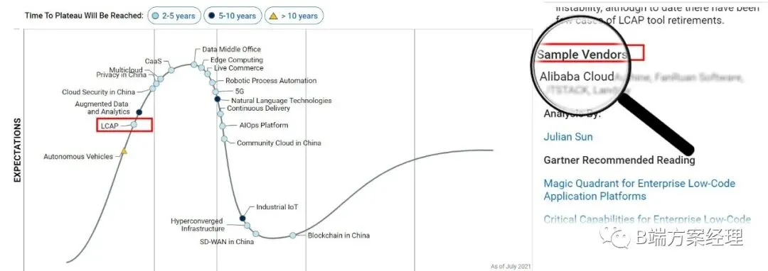 技术维度:每年的年中,大家都会看这张图,高德纳的技术成熟度曲线,大概得出的结论,低代码、安全建模关注,NLP\OCR\RPA成熟;