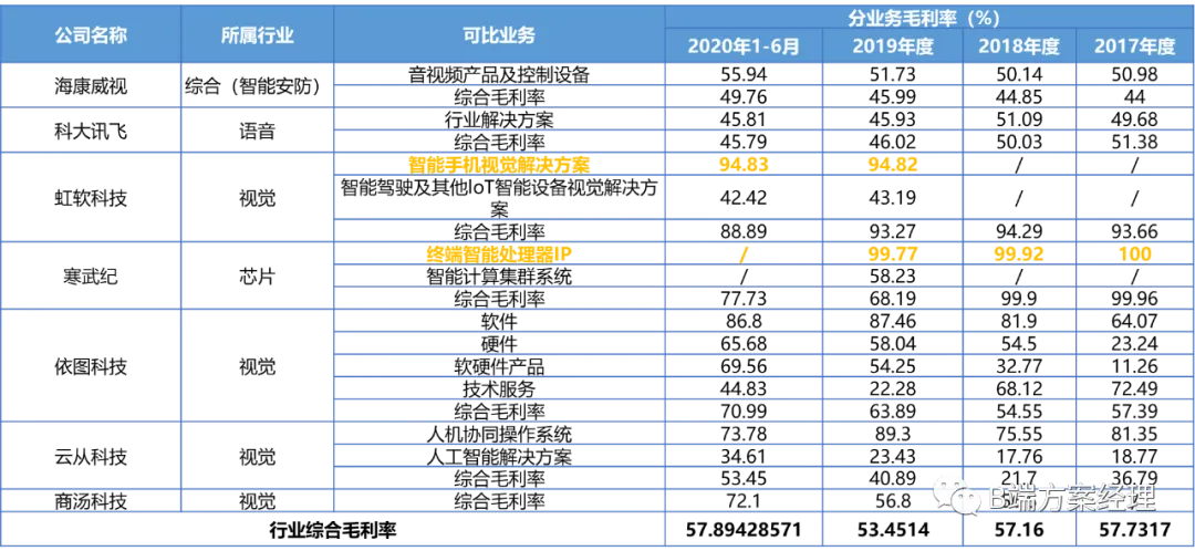 我们再来看毛利率:我把AI涉及到的语音、视觉、芯片类的公司做了一个横向对比,整个行业的综合的毛利率初步算下大概是56.6%;