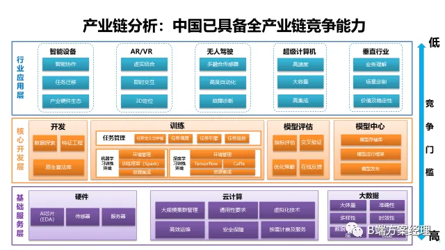 站在整个产业链角度,主要分为基础服务层、核心开发层及行业应用层,在整个基础层最大的问题在于芯片制造以及整个算力成本的问题。