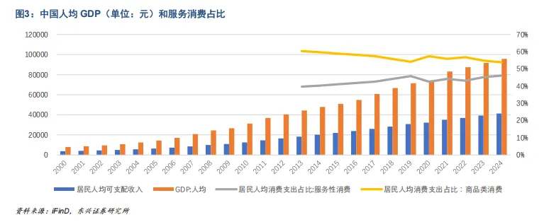 2.预计未来随着国内人均GDP的增长,服务消费占比将逐步超过商品消费。