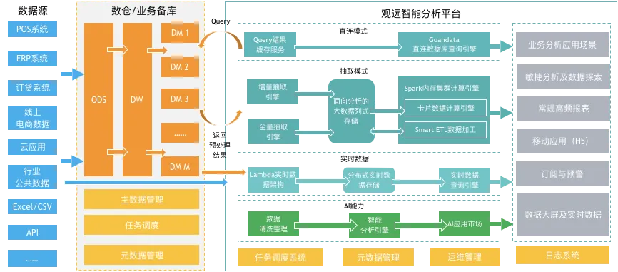 传统数仓建设周期长且费用高,对于暂时没有数仓的茶饮企业来说,观远数据一站式智能分析平台可为茶饮行业打通线上线下多渠道数据源,无缝对接ERP、POS、CRM、外卖、进销存等业务系统,实现个各个环节的数据实时同步。