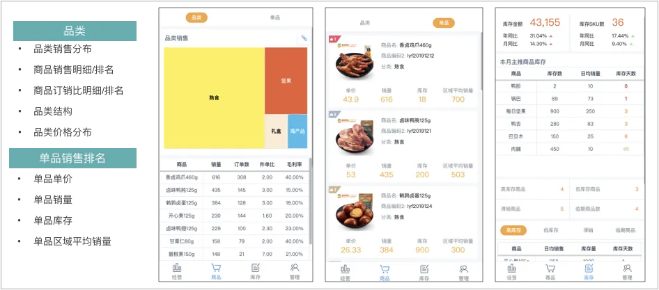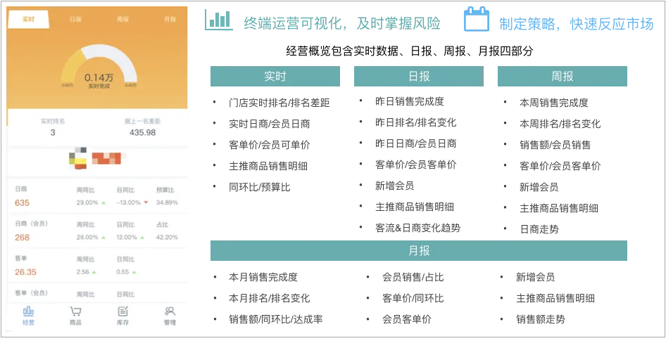 同时,还可为各门店负责人提供移动端口袋数据助理,提供包含实时数据/日报/周报/月报在内的经营概览实时知晓,使得终端运营可视化,在碎片化时间随时随地就可掌握业务动态。