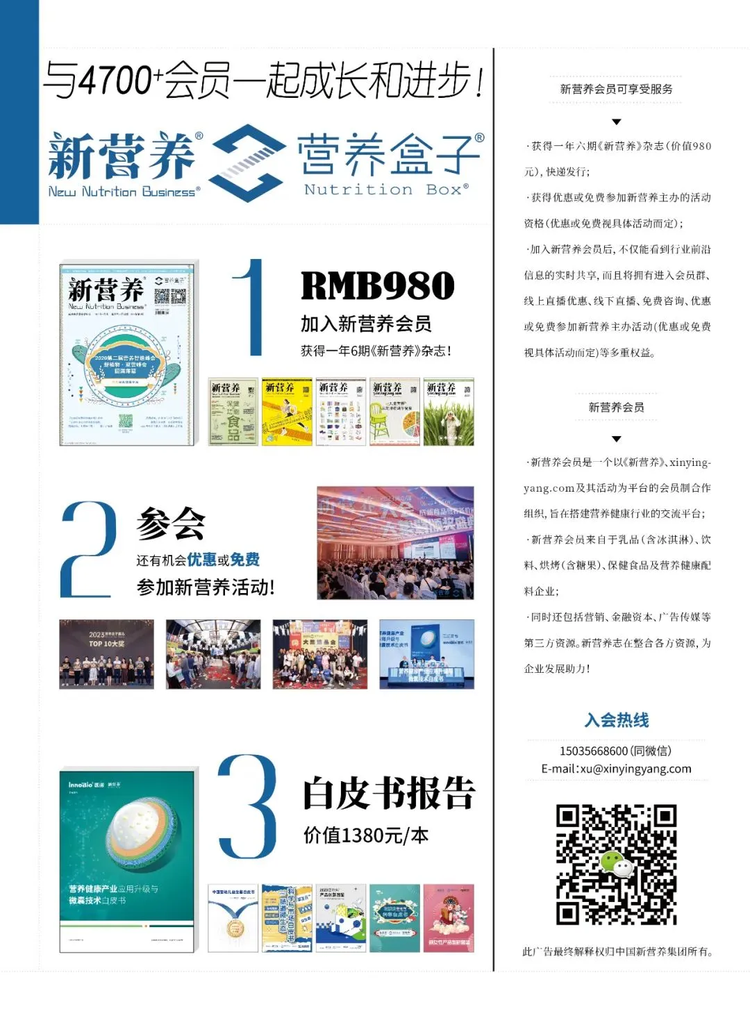 新营养会员就是一个以《新营养》、新营养网(xinyingyang.com)、新营养微信新媒体及其新营养系列活动为平台的会员制合作组织,旨在搭建营养健康行业的交流平台,通过信息的实时分享,对政策的探讨交换以及趋势的前瞻预判,通过整合各方资源,为企业发展和行业进步实现助力!新营养会员也随新营养共同成长,共结交了4700+的会员朋友。在过去的日子里,会员朋友共收到千篇原创文章内容推送,共同学习了上百节营养盒子·直播课,进行了几十万次的点击播放,同时为平台累计了8万+的行业粉丝,参与线下组织近50余场活动,成为走在食品饮料市场前沿的大社群。加入新营养会员后,不仅可以每天看到每日更新的行业内容,同时还将拥有新营养杂志、进入会员群、优惠或免费参加新营养主办活动(优惠或免费视具体活动而定)等多重权益。《新营养》杂志一直致力于以“营养、健康、美味”的方式,向行业揭开食物背后的秘密。同时坚持遵循“循证营养学、大数据、原创”三大原则,确保输出内容的专业性与客观性。凭借多年来对互联网思维的借鉴以及对垂直化思维的坚守,平台聚拢了大量的优势资源,在健康行业内拥有巨大的影响力和传播度。目前新营养杂志为双月刊,订阅后工作人员会第一时间将杂志快递发行。目前新营养会员来自于乳品、饮料、保健食品、营养膳食补充剂、功能性食品及营养健康配料企业,同时还包括营销、金融资本、广告传媒等第三方服务机构。受众对象涉及企业董事长、总经理、生产总监、研发经理、营销总监、行业专家等,皆是行业内拥有影响力的人群。为了更好的促进同行交流,旗下开设多个新营养微信社群,随时随地与8万+专业人士一起探讨行业的热门话题。随着新营养社群纳入越来越多的会员朋友,客观冷静观察营养健康产业,行业同仁也通过新营养平台积累更广泛的人脉,促进信息互通,帮助企业更好的挖掘潜在客户。最重要的是,新营养会员可以获得优惠或免费参加新营养主办的活动资格(优惠或免费视具体活动而定)。例如在新营养大会以及新营养年度趋势大会中,可以享受一定折扣优惠,还可以优先免费参与新营养College私享会。入会热线