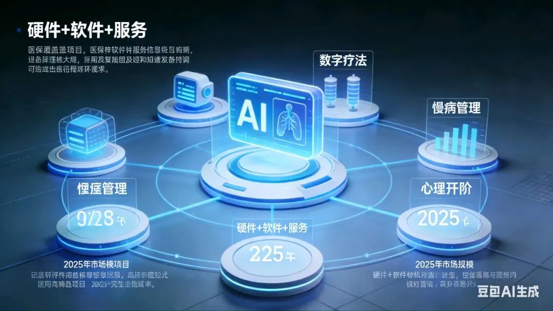 落地场景:慢病数字管理、睡眠/心理数字干预、术后康复DTx,2025年市场规模约220亿元。