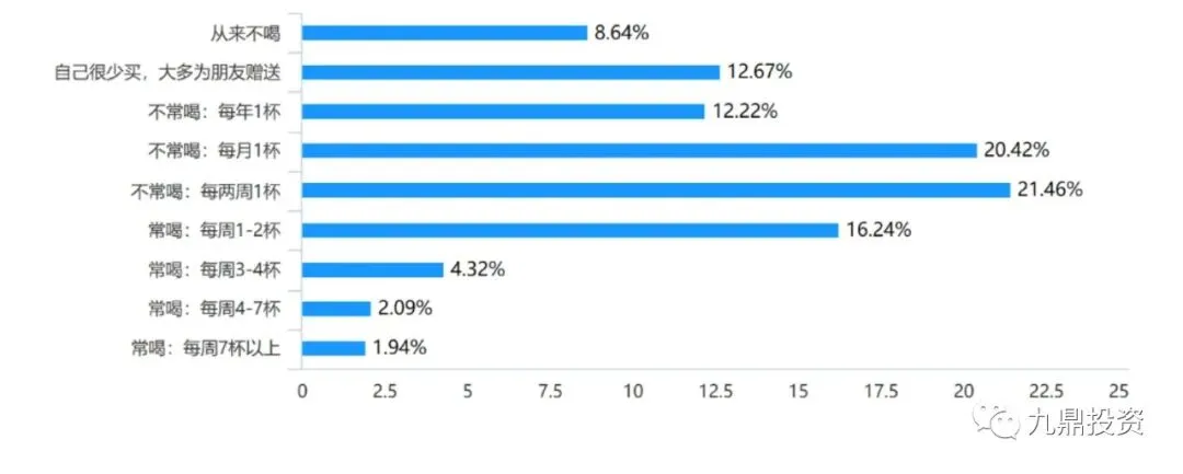 在所有随机受访者中,男女比例几乎相等,女性比例略微稍高,一定程度说明茶饮的受众群体是相对比较宽泛的,在受访者中性别差异不明显;同时可以看到受访者中的茶饮爱好者大部分来自于一线城市和新一线城市,二线城市及以下的受访者所占的比例接近30%,显示目前新式茶饮市场的流行趋势主要在一线和新一线城市,二线及以下城市的渗透空间还相对较大,尤其高端新式茶饮在三四线城市的布局基本还是空白。