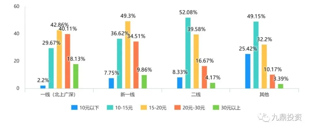 用户所在城市和杯单价格的交叉分析表明,随着城市线级下降,10元以下和10-15元饮品占比提升,20-30元和30元以上饮品占比下降,可以说随着城市等级的下降,整体的购买力有一定程度的下降但并不明显。