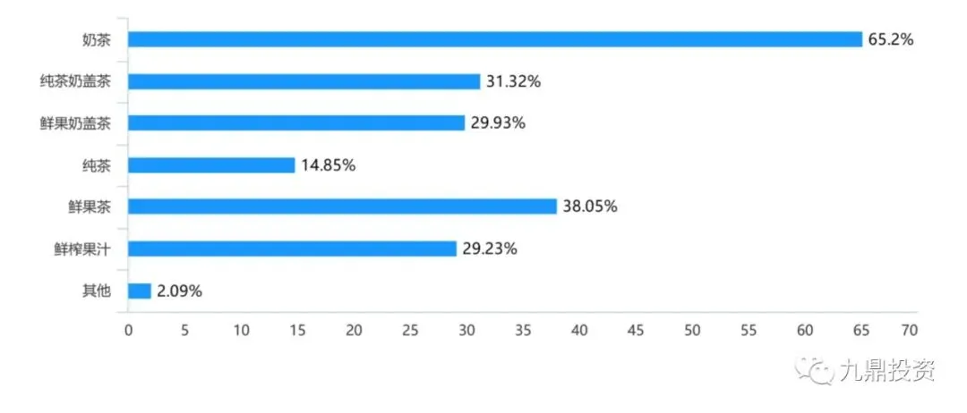 最经常购买的茶饮品类中,奶茶仍然是主流饮品,其次是鲜果茶和奶盖茶。随着新式茶饮的兴起,新式茶饮主要是在品质上进行了提升,对于大多数消费者来说,奶茶(奶加茶)的饮用习惯和频率还是最高的,同时也能看到,鲜果茶、奶盖茶作为高端新式奶茶的新兴的品类购买的比例也相对较高。新式茶饮企业在巩固自身的特色拳头产品的同时都在不断地丰富传统奶茶的配置,如奈雪的“宝藏”系列和喜茶的“波波牛乳”系列。