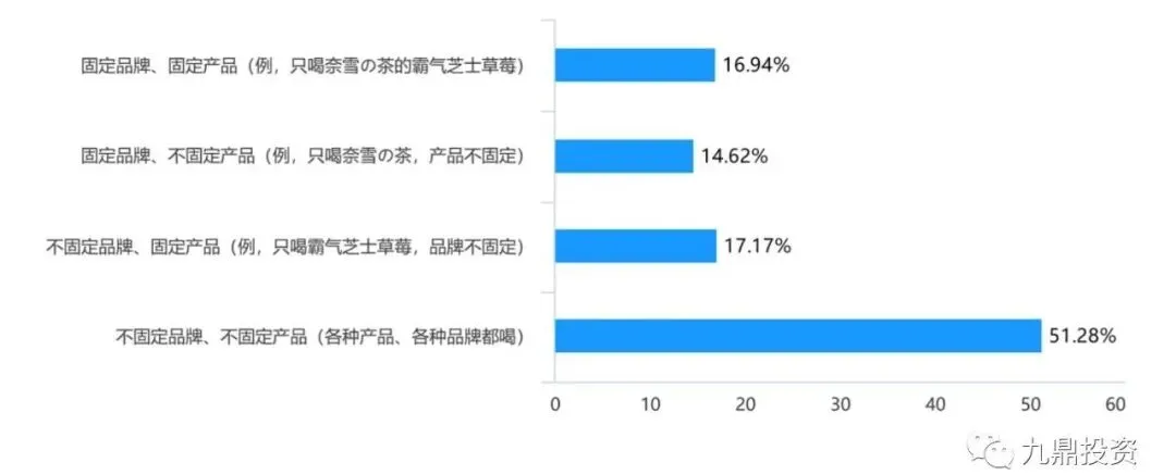 一半左右的用户会倾向选择固定品牌或品牌产品,其他用户的消费比较随机,这也是消费特性带来的。现制茶饮如何通过门店密度的增加和外卖半径的扩大来更大程度的触及到消费者并且增加消费者的购买便利性是线下连锁门店拓展需要做足的功课之一。