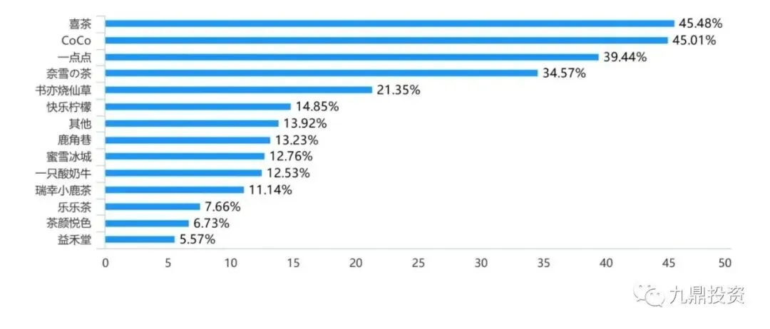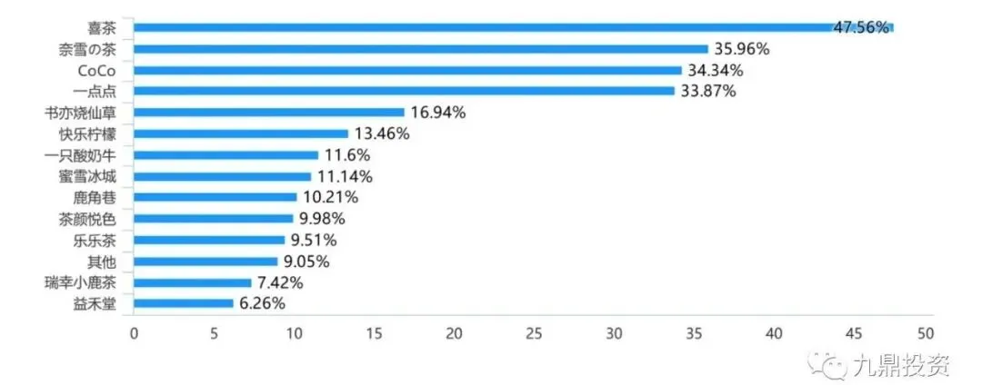 消费者心中的头部品牌相对稳定,喜茶和奈雪分别为高端品牌的前两名,CoCo和一点点分别为中端品牌的前两名,全国茶饮品牌的格局基本形成。