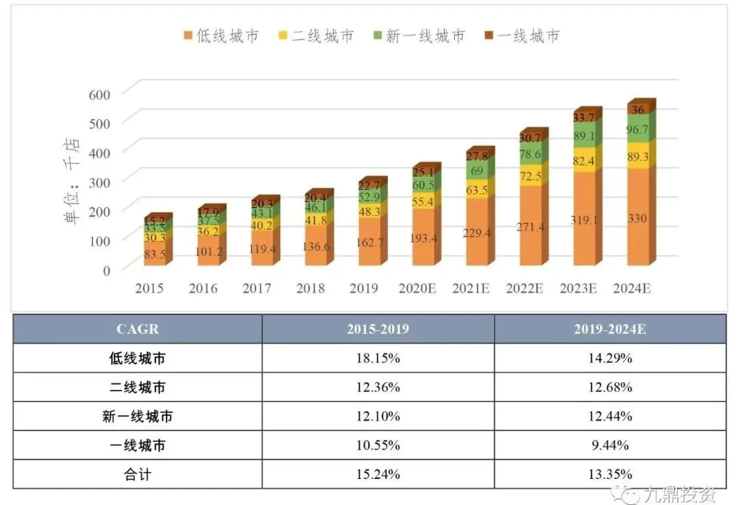 新式茶饮门店数量从2015年的16万家到2019年的28.6万家,整体复合增速15.24%,从2019年到2024年预期55.2万家,预计复合增速达到13.35%。其中增速较快的为新一线、二线及低线城市,增速基本能够达到10%以上。