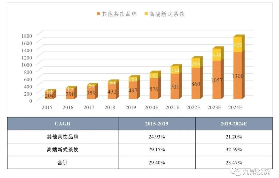 新式茶饮市场从2015年的230亿元增长到2019年的600亿元,整体复合增速29.40%,预计到2024年增长到1722亿元,整体复合增速23.47%。其中高端新式茶饮从2015年10亿的市场规模增长到2019年达到103亿的市场规模,复合增速达到79.15%,预计2019年至2024年市场规模将增至422亿,复合增速达到32.59%。
