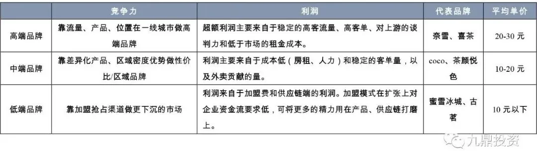 高端的靠流量、产品、位置在一线城市做品牌;中端的靠差异化产品、低成本(小店)、区域密度优势做性价比/区域品牌,低端的靠加盟抢占渠道做更下沉的市场。