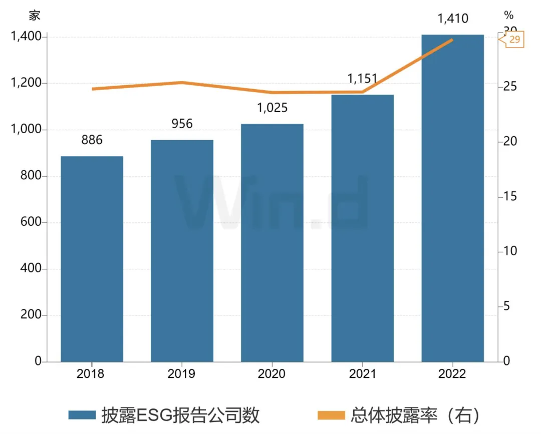 根据Wind ESG数据统计,截至2022年4月30日,本年已有1410家A股上市公司披露独立ESG报告,占全部A股公司数的29%,较去年增长22.5%。