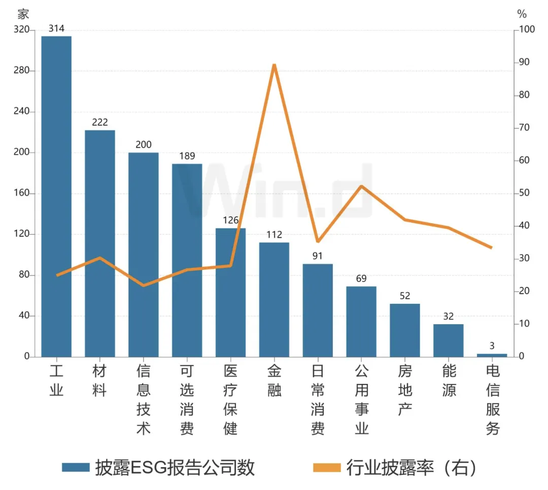 从行业分布来看,披露独立ESG报告的工业公司数量最多,共计314家。金融业的披露率最高,高达89.6%。