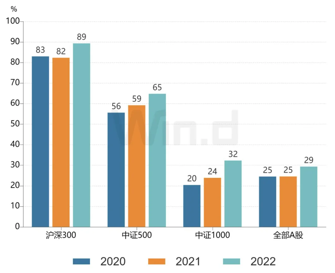 按指数成分股划分,沪深300指数成分公司披露率最高,2022年已有89%的公司披露独立ESG报告。中证1000指数成分公司的增长速度最快,较2021年披露率上升8%。