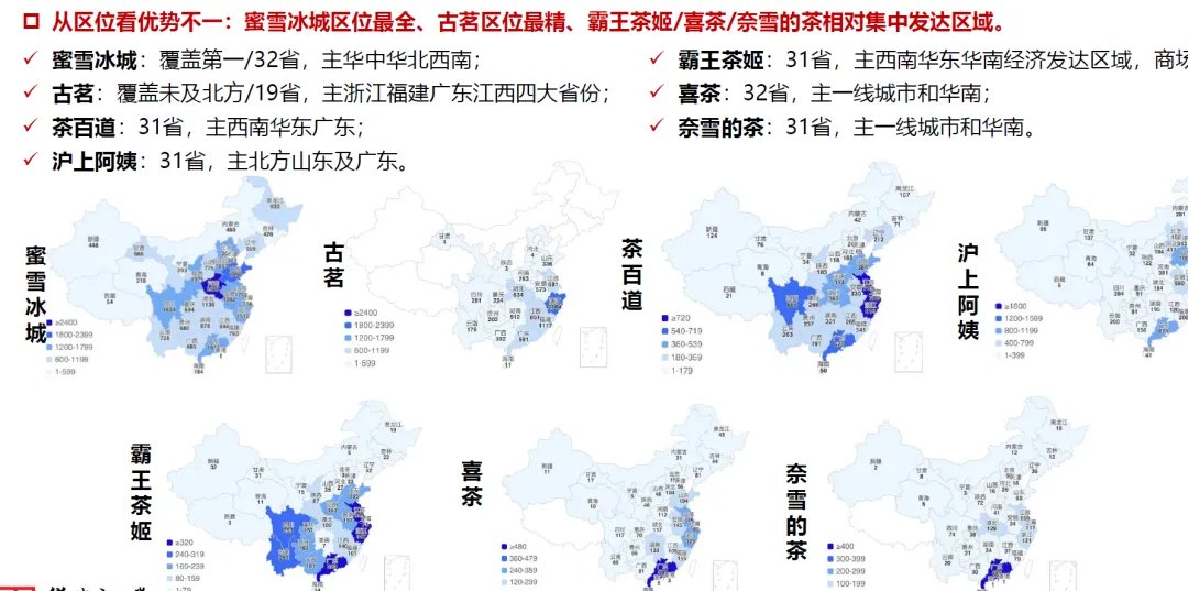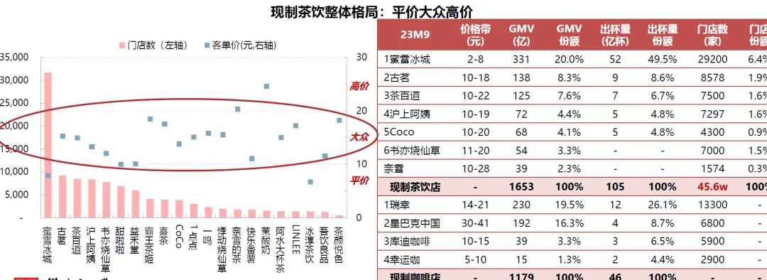 平价:蜜雪冰城独占主导。定价2-8元的蜜雪冰城是平价市场的绝对主导,其GMV份额20%/量份额50%,几乎无同等竞争对手,在现制饮品领域其GMV已超中国咖啡GMV第一的瑞幸、全球仅次于星巴克。大众:充分竞争百家争鸣。当前百亿级别的古茗、茶百道、霸王茶姬占位领先,竞争已趋白热化。当前高价品牌奈雪的茶、喜茶纷纷降价进入大众市场(最低10元)并开放加盟,梯队竞争日趋激烈。高价:底部崛起倒逼降级。