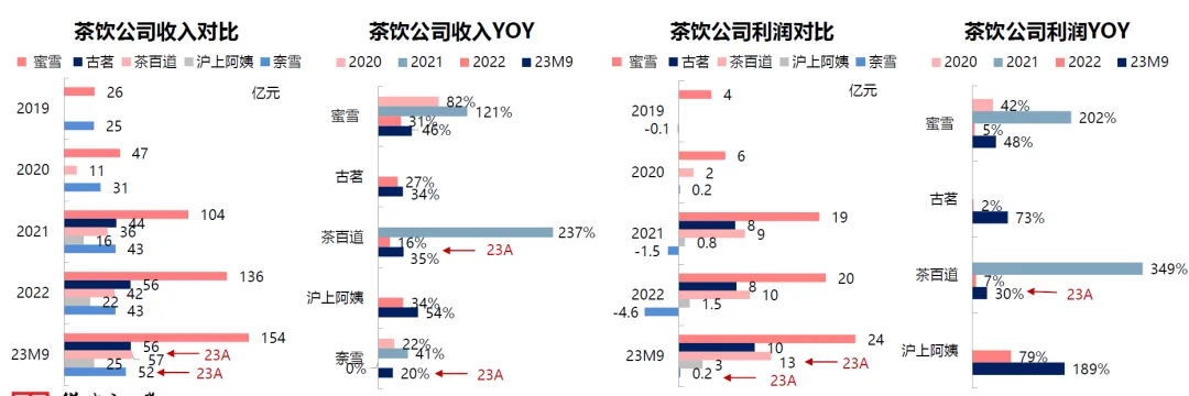 收入YOY:蜜雪冰城/奈雪的茶起始收入相当,蜜雪扩张积极、古茗稳扎稳打、茶百道/沪上阿姨于21/23年爆发开店;奈雪的茶因直营模式增速相对偏弱;