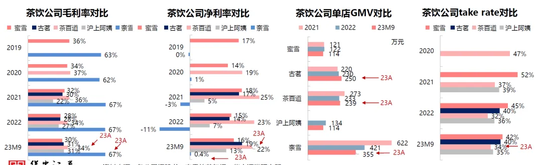 毛/净利率:蜜雪冰城/古茗毛利率相当,差异在销售投入影响净利率;茶百道净利率高于同业,因毛利率偏高;沪上阿姨净利率低于同业,规模效应尚待加强;直营模式的奈雪毛利率较高但净利率偏弱。单店GMV:蜜雪冰城/古茗健康,蜜雪门店加密下单店产出并未降低,古茗21-23年同店增速甚至连续增长12%/3%/9%Take rate:蜜雪冰城/古茗较高,体现其供应链价值;茶百道较低,或因原料定价且外卖占比更高(公司60%vs行业56%)