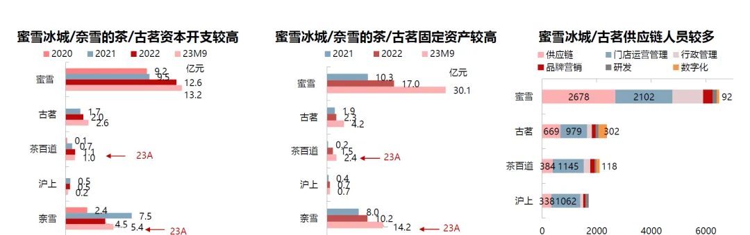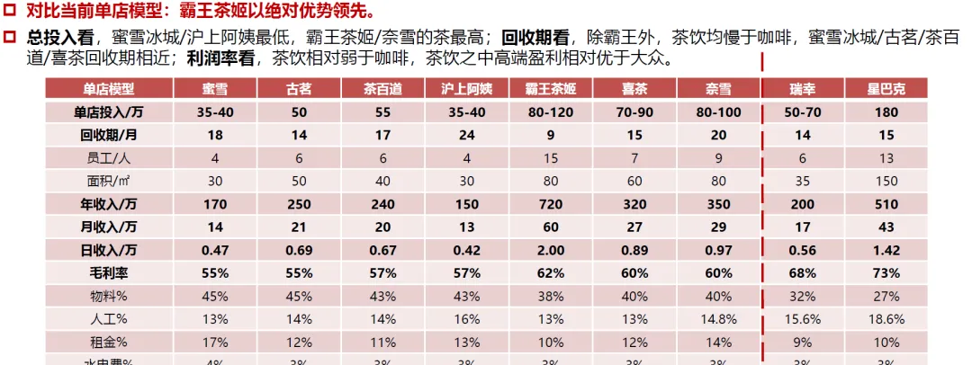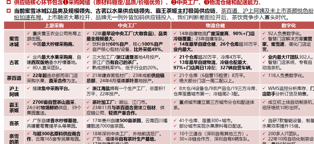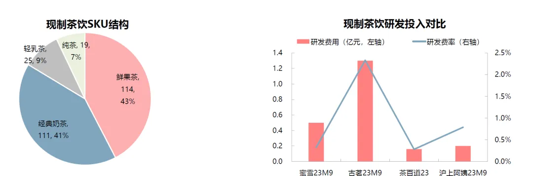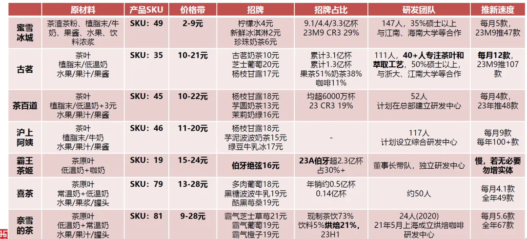蜜雪冰城:薄利多销不难喝是王道,茶渣茶沫+植脂末+果酱等原料,但储运方便供应链相对简单。古茗:主打水果茶,曾为喜茶平替,推新快,研发投入最高茶百道:主打水果茶,研发费率最低。沪上阿姨:主打水果茶,子品牌茶瀑布对标蜜雪