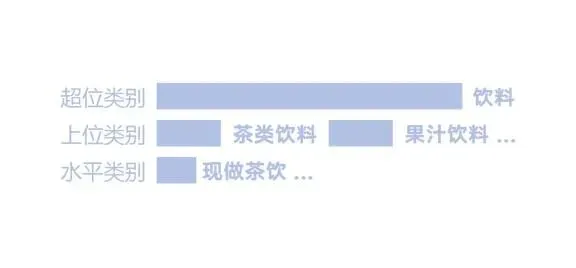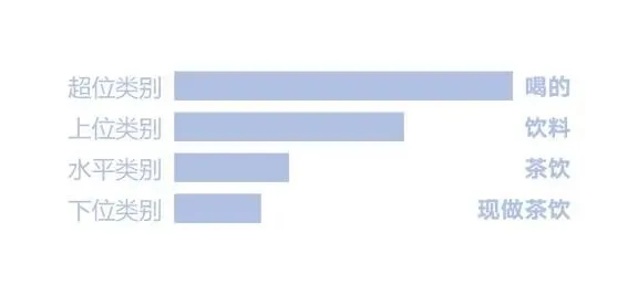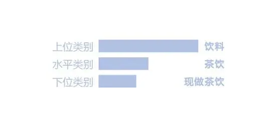 通过这3个问答可以发现,说的3个类别的类位分布是有层级关系的,在这个局部类位层级分布图中,它们的类位关系可以表现为这样,为了清楚的表示它们之间的关系,需要给不同层级的类位进行类位命名,饮料可以叫作上位类别;茶饮可以叫作水平类别;现做茶饮可以叫作下位类别。每一个类位分布层级之间,核心属性和满足的需求是完全不一样的。