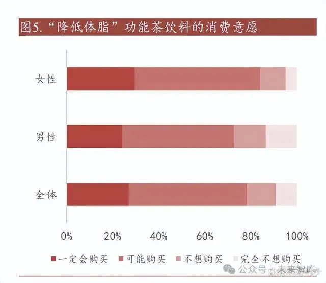 日本居民关注无糖茶饮料的功能性,女性更为关注无糖茶降体脂功能,男性 更为关注降血糖功能。MacroMill 无糖茶饮料调查问卷显示,对于“降低体 脂”功能茶,78.3%的人有购买意愿(包含“一定会购买”和“可能购买”), 而女性中有购买意愿的比例高达 84.1%,比男性比例高 11.5%。对于“降低 血糖”功能茶,60%的人有购买意愿,而男性有购买意愿的达到 64.9%,比 女性比例高 9.8%。