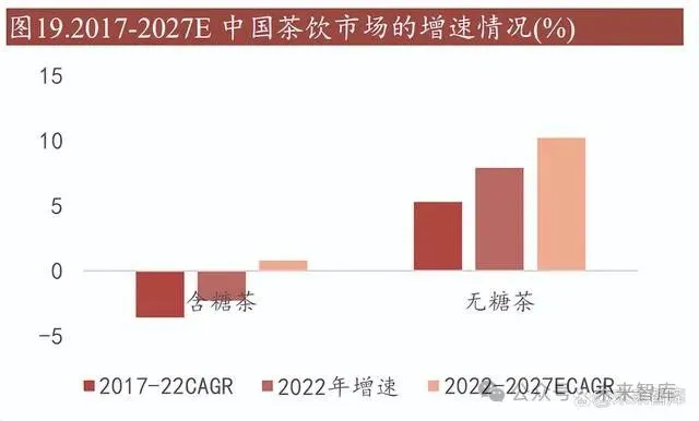 亿欧智库数据显示,中国无糖茶饮增速远超其他茶饮赛道,2017-2022,含糖茶饮已经进入低速增长,而无糖茶饮在 2022 年保持 7.9%的增速,远高于含糖茶饮; 亿欧智库数据预计 2022-2027 年无糖茶饮 CAGR 达 10.2%,市场规模即将达百亿 元,未来五年,中国茶饮市场将进入无糖茶饮的高速增长期。