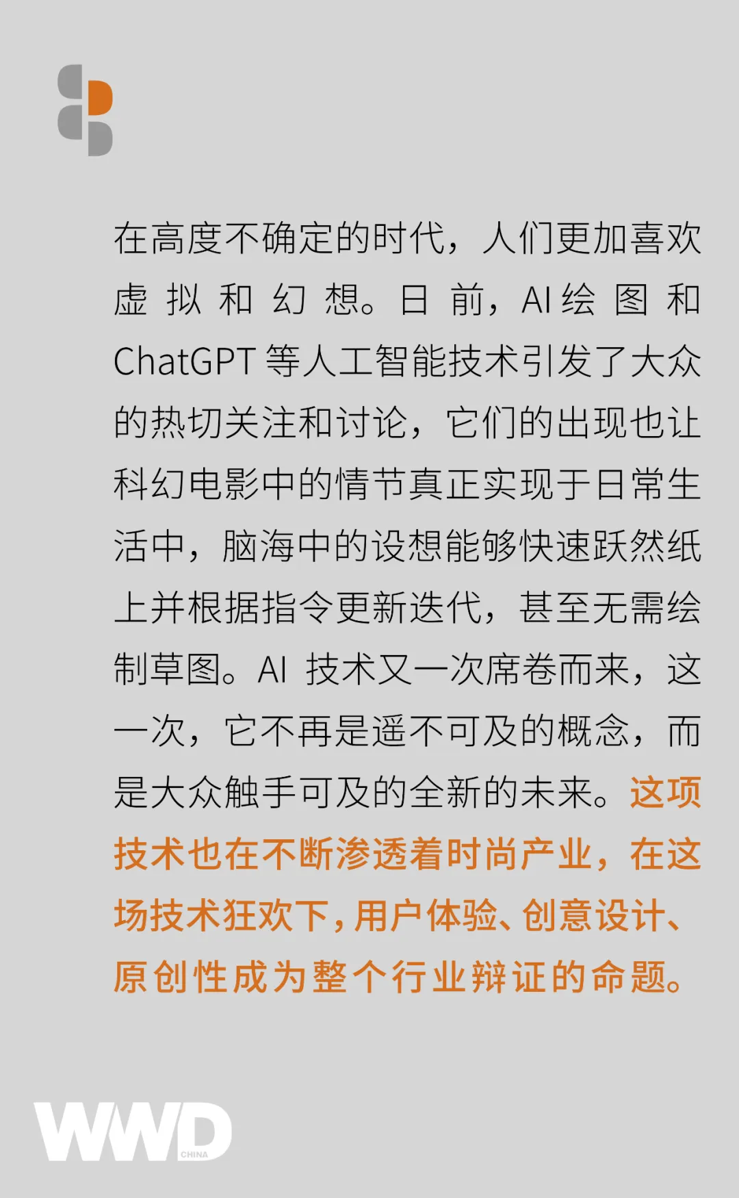 科技浪潮以更强的姿态席卷而来,时尚产业将花更长的时间去接受及应对。但其实,在焦虑情绪笼罩下,行业不妨保持乐观态度,当 AI 创作出“古驰的黑客帝国”、“巴黎世家的星球大战”、“巴黎世家的办公室”,也同样能通过目标检测识别假 logo,能打假的 AI 也是备受瞩目的工具。人类历史进程中,印刷、摄影等技术层出不穷,都没有让艺术变得黯淡无光。AI,亦是如此。WWD