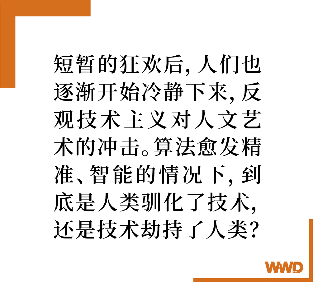 毫不扩张地说,AI 技术成为时尚行业潜在游戏规则的改变者。如今,“从无到有”的速度甚至只有几秒,“草稿”这一概念也将逐渐淡去,“解放双手”的人工智能工具爆炸性流行,开启了创造力的 2.0 阶段。可以说,现在唯一的障碍就是自身的想象力。在短暂的狂欢后,人们也逐渐开始冷静下来,反观技术主义对人文艺术的冲击。算法愈发精准、智能的情况下,到底是人类驯化了技术,还是技术劫持了人类?AI 智能的发展又将对时尚文化产生怎样的影响,创造性劳动是否会退化?