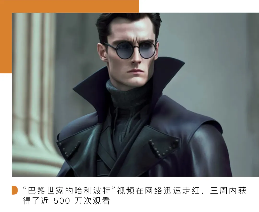 上个月,“巴黎世家的哈利波特”视频在网络上迅速走红,三周内获得了近 500 万次观看。在视频中,哈利波特电影中的角色在T台上穿着巴黎世家的服饰走秀,他们穿着哥特式斗篷和皮夹克,嘴里还说着糅合了时尚用语的经典人物台词。这一视频是网友通过 ChatGPT 和 Midjourney 制作而成,影像逼真而不违和,视频的创作者说这一视频展示了 AI“创造电影般的时刻”的奇迹。