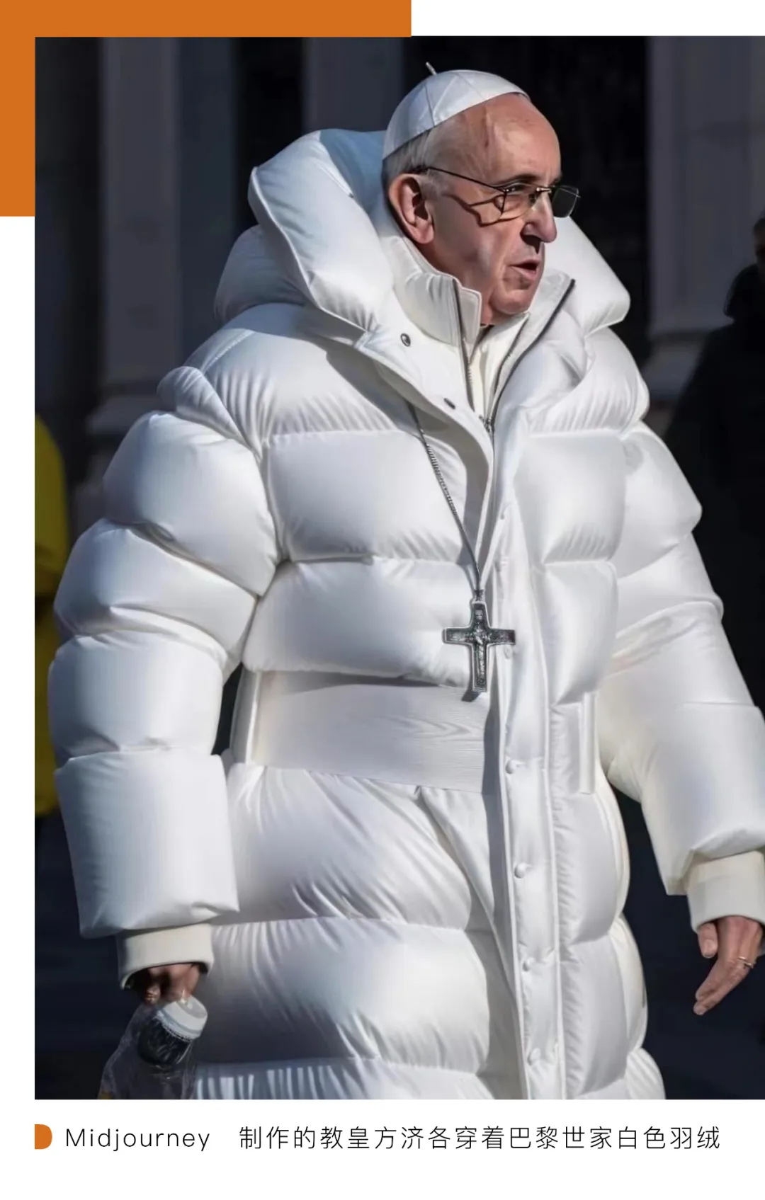 巴黎世家的外套也许给人们敲响了警钟。近日,一张教皇方济各穿着该品牌白色羽绒服的逼真照片在互联网上引起了轩然大波。这张照片是由一名芝加哥男子使用 Midjourney 制作的,关键词包括天主教教皇方济各、巴黎世家的蓬松大衣、巴黎的街道,这张图像的细节和质地让大多数人看起来是一张真实的照片。