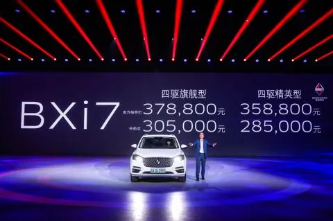 宝沃BXi7同样推出两款产品,官方指导价为35.88-37.88万元。-该车在前后轴分别搭载了一台电动机,综合最大功率为178千瓦,最大扭矩为390牛·米,并配有四驱系统,该车还提供了Eco(经济模式)、Comfort(舒适模式)、4WD(强制四驱模式)、Sport(运动模式)及Sport+(超级运动模式)在内的五种驾驶模式。官方标称的0—100公里每小时加速时间为7.9秒。