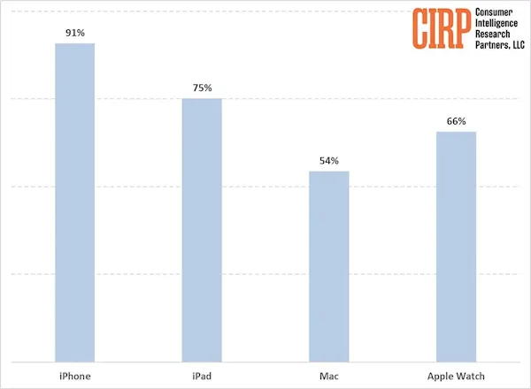 发现其中有91%的用户拥有iPhone,75%的用户拥有iPad,66%的人拥有Apple Watch,54%的用户拥有Mac电脑。