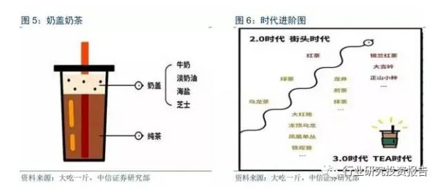 进阶迭代,健康升级,由粉末、街头走向TEA时代;具备“休闲化、社交化、标签化”新属性,代表全新生活方式。中国茶饮连锁业发展三阶段:以粉末冲调,不含奶也不含茶的“粉末时代”;茶末和茶渣做基底茶、有鲜奶出现的“街头时代”;2015年以来的用专业设备精萃上等茶叶、配以奶盖/水果、装修舒适的“新中式茶饮”时代。消费升级大背景下,消费者购买新式茶饮不仅获得产品本身的饮料功能,同时还有张弛有度、劳逸结合的社交价值和休闲价值,与年轻消费群体对生活方式和身份认同的追求不谋而合,兼具时尚标签属性。