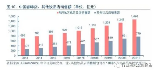 2016年,咖啡及其他饮品店销售额合计926亿元,同比+8.2%;其中,其他饮品店(如甜品店、各类水吧、传统奶茶店、传统茶社、新中式茶饮等)销售额413亿元,同比+14.5%。预计2021年,咖啡及其他饮品店销售额将达1476亿元,2016-2021年CAGR+9.8%;其中,其他饮品店销售额有望达779亿元,2016-2021年CAGR+13.5%。