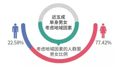 “中国式相亲”中本地人优先的现象已普遍存在。调研发现,有近五成的单身男女在择偶时会考虑地域因素。其中, 77.42%的女性在择偶时会看“产地”,远高于男性,可见女性在婚恋择偶中会更重视地域因素。