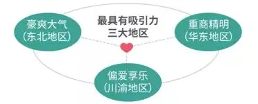数据显示,豪爽大气(东北地区)、偏爱享乐(川渝地区)以及重商精明(华东地区)等地域特色对于单身男女最有吸引力。