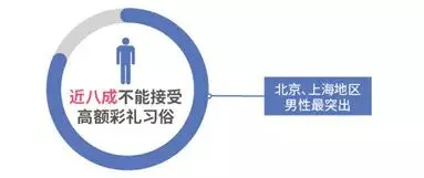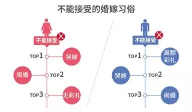 各地的婚嫁习俗也是跨地域婚恋的青年男女必须要面对的问题。据调查显示,在各种婚嫁习俗中,单身女性最不能接受的前三名依次是哭嫁、闹婚和无彩礼,而单身男性最不能接受的前三名依次是高额彩礼、哭嫁和闹婚,其中有高达近八成的男性不能接受高额彩礼习俗,且北京、上海地区男性最突出。高额彩礼的城市中,北京、上海、杭州居前三,彩礼金额高达11万到20万之间。
