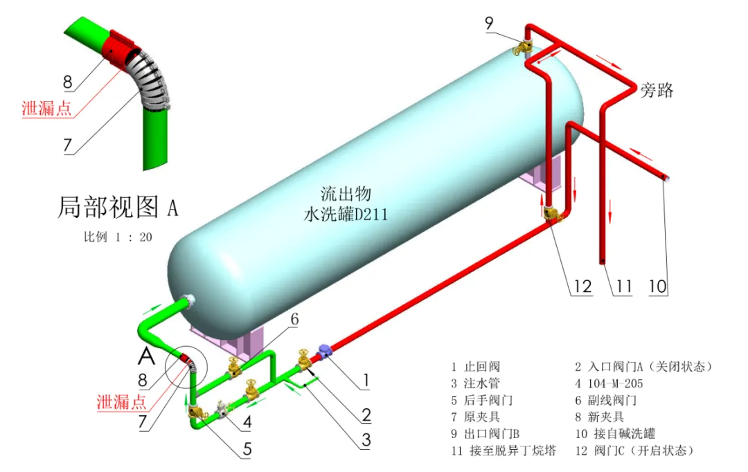 13时24分10秒,在新夹具两侧各安装紧固1套螺栓时,原夹具水平端的管道焊缝处突然断裂,大量介质从断口喷出。现场监护人员立即向外疏散并安排烷基化装置内操人员紧急停车。