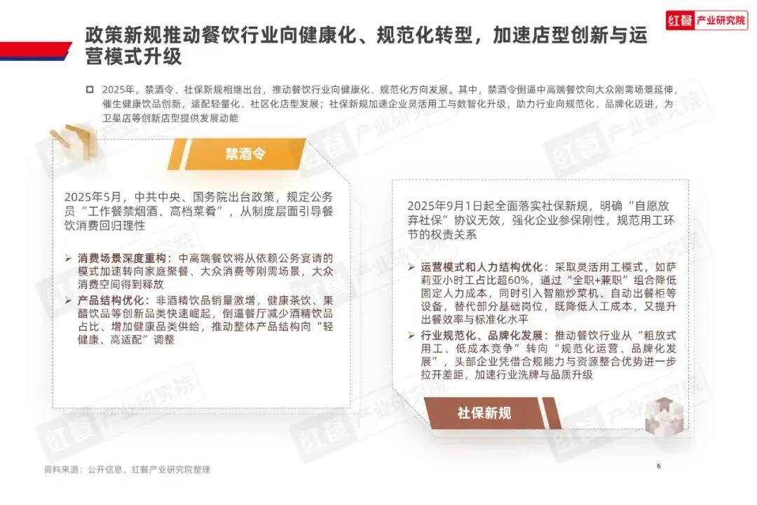政策合规:禁酒令、社保新规推动行业规范化,健康化转型成为必修课。 下沉市场机遇:中西部及县域市场连锁化率提升,快餐与高端“质价比”品牌并行发展。 可持续发展:绿色供应链、低碳包装技术应用加速,响应消费者环保需求。