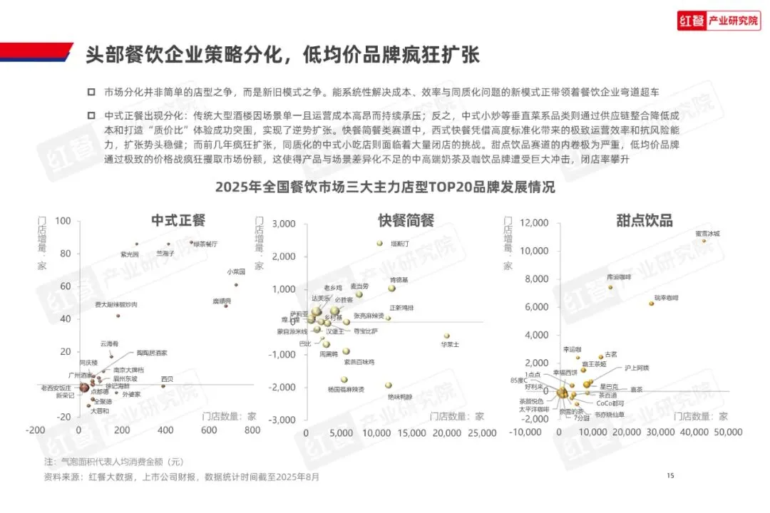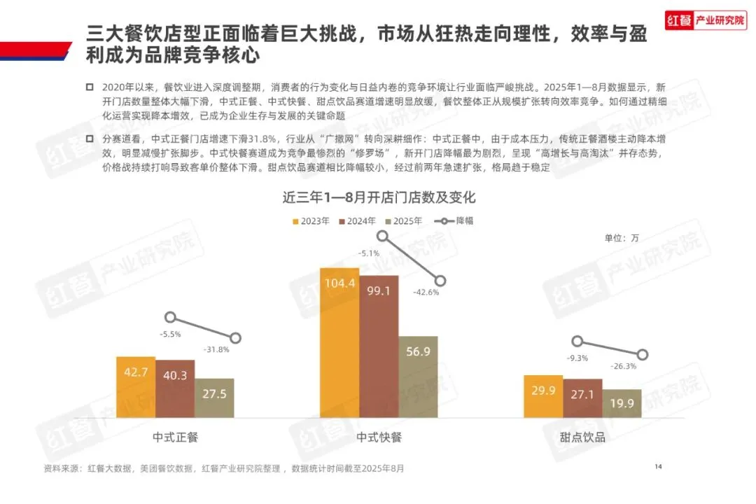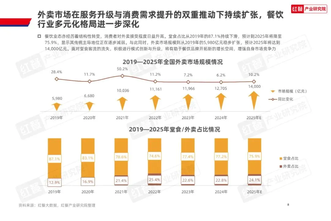 2025年1—8月中国餐饮收入达36,480亿元,同比增速放缓至3.6%,闭店数量持续攀升,新增门店波动加剧,反映行业进入存量竞争阶段。消费端呈现“悦己”需求与质价比追求并存的特征,外卖市场规模预计突破1.4万亿元,堂食占比降至75.9%,倒逼品牌通过店型创新破局。